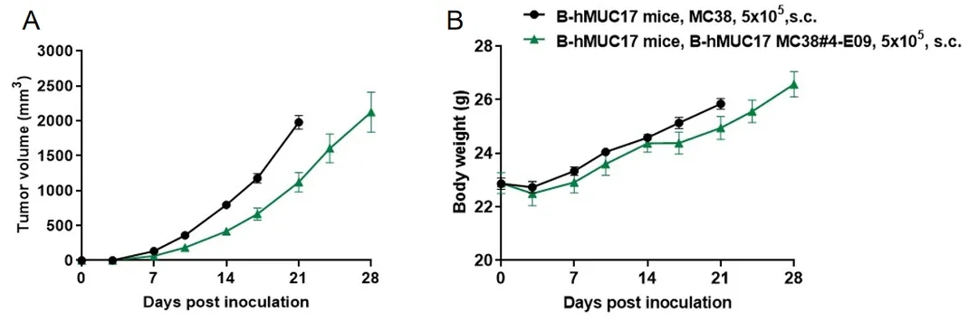 将B-hMUC17 MC38细胞(5x105)和野生型MC38细胞(5x105)皮下植入杂合子B-hMUC17小鼠(雄性,8周龄,n=6)。每周2次测量肿瘤体积和体重。(A)平均肿瘤体积±SEM。(B)体重(Mean±SEM)。体积以mm3表示,公式为:V=0.5×长径×短径2。如A图所示,B-hMUC17 MC38细胞在杂合子B-hMUC17小鼠体内能够形成肿瘤,可用于临床前药效研究。