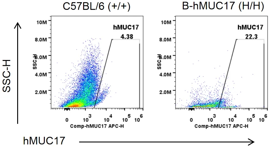 流式细胞术分析纯合子B-hMUC17小鼠种属特异性MUC17的表达。从野生型小鼠(+/+)和纯合子B-hMUC17小鼠(H/H)肠道组织匀浆中获得单细胞悬液,用抗人MUC17抗体流式细胞术进行分析。结果显示:人MUC17仅在纯合子B-hMUC17小鼠中检测到(H/H),而在野生型小鼠中检测不到(+/+)。