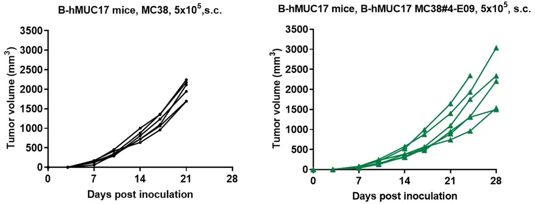 将B-hMUC17 MC38细胞(5x105)和野生型MC38细胞(5x105)皮下植入杂合子B-hMUC17小鼠(雄性,8周龄,n=6)。如图所示,B-hMUC17 MC38细胞能够在体内形成肿瘤,可用于临床前药效研究。
