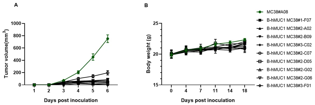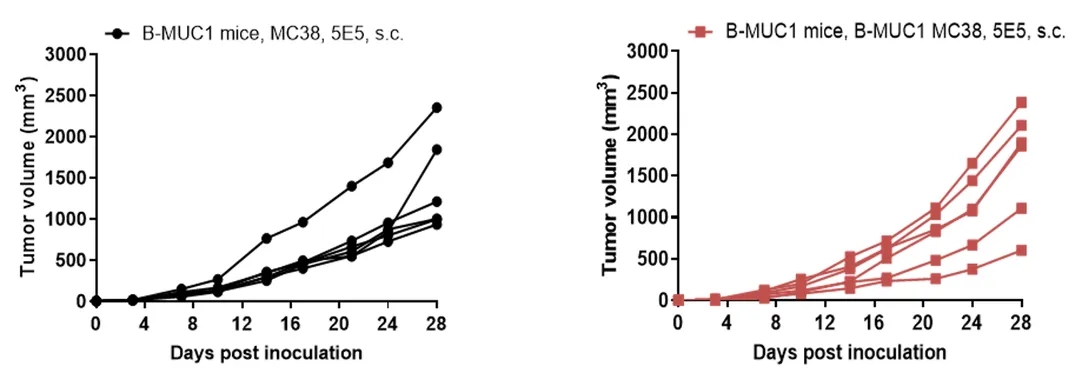 将B-hMUC1 MC38细胞(5x105)和野生型MC38细胞(5x105)皮下植入B-hMUC1小鼠(雌性,8周龄,n=6)。如图所示,B-hMUC1 MC38细胞能够在体内形成肿瘤,可用于临床前药效研究。