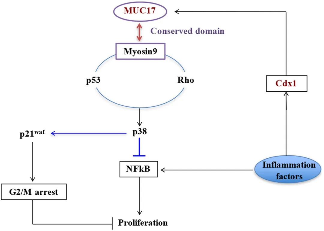 肿瘤基因组图谱数据库分析表明 MUC17 在胃癌(GC)标本中表达更高, 在其他多种癌症(如胰腺癌) 中也表达异常。 在炎性肠病和肠道肿瘤中,MUC17 的表达显著被下调,致使细胞降低粘附活性,MUC17 的缺失可作为结肠癌的早期预警。在胃癌中, MUC17 高表达, 炎症因子通过CDX1 诱导 MUC17 表达。作为一个保护因素,MUC17 通过维持 MYH9-p53-RhoA 调节反馈环,然后激活 p38 信号使其失活,从而抑制炎症因子的作用[6]。