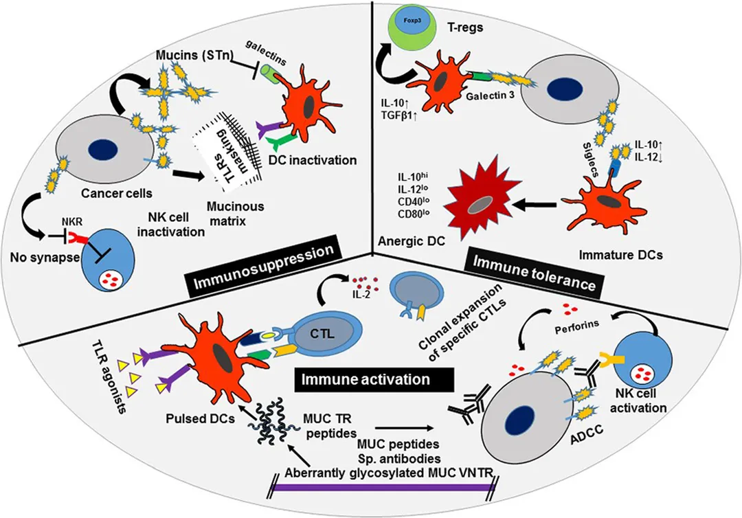 有研究表明,肿瘤细胞表面的MUC1的表达比正常细胞表面高100多倍,且肿瘤细胞失去了顶点突触极性,低糖基化的MUC1会在整个细胞表面表达,且通常靠近生长因子及其受体并与其相互作用,MUC1-C通过细胞内信号传导及相关生物分子的调节从而参与肿瘤细胞的侵袭、转移及血管生成等。在感染相关癌症中,感染期间,上皮细胞表面的MUC1与入侵的微生物相互作用并根据不同的微生物和细胞类型引发促炎或抗炎反应;在肿瘤中,过表达的MUC1可以抑制NK细胞对肿瘤细胞的杀伤作用,此外,MUC1 高表达还可以抑制CTL的增殖, 甚至可以诱导CTL凋亡[4]。