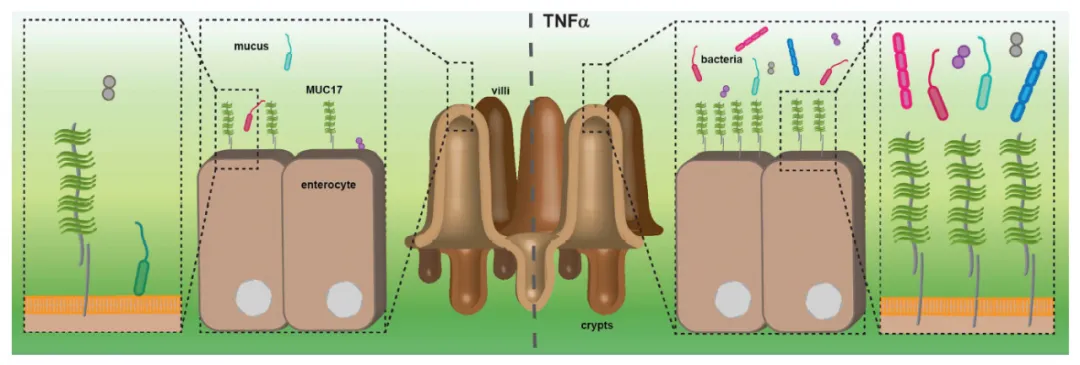 研究表明,长期用促炎性细胞因子TNFα刺激诱导炎性状态会导致MUC17的增加,进而保护Caco-2细胞免受肠病原性大肠杆菌的黏附。这个研究结果说明MUC17在炎症中充当第二道防线的功能。