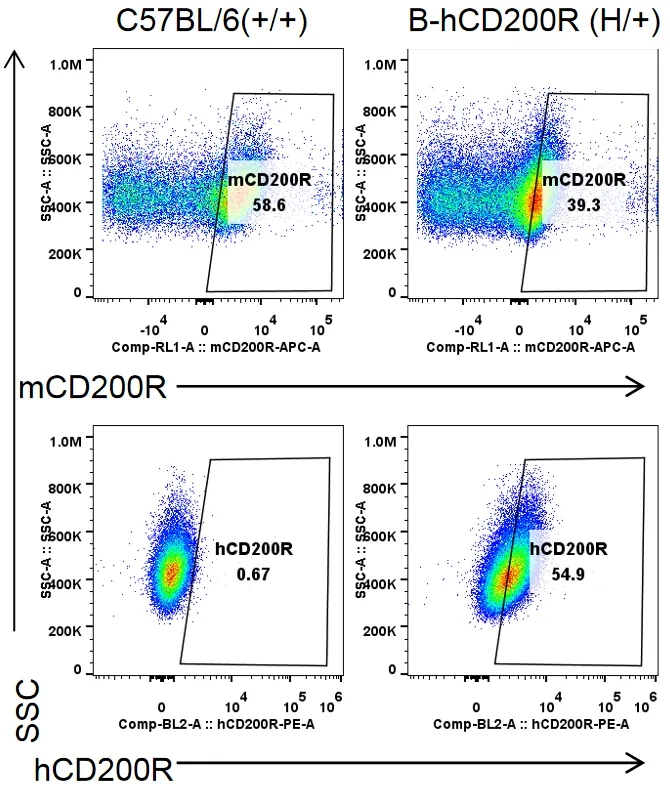 收集野生型C57BL/6小鼠(+/+)和杂合B-hCD200R小鼠(H/+)腹膜巨噬细胞,用种属特异性抗CD200R抗体流式细胞术进行分析。小鼠CD200R在C57BL/6小鼠和杂合B-hCD200R小鼠中均可检测到。人CD200R仅在杂合B-hCD200R小鼠中检测到,而在C57BL/6小鼠中检测不到。