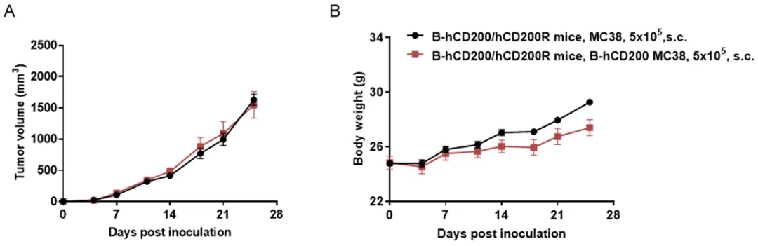 将B-hCD200 MC38细胞(5x105)和野生型MC38细胞(5x105)皮下植入B-hCD200/hCD200R小鼠体内(雄性,7周龄,n=6)。每周2次测量肿瘤体积和体重。(A)平均肿瘤体积±SEM。(B)体重(平均值±SEM)。体积以mm3表示,公式为:V=0.5×长径×短径2。如A图所示,B-hCD200 MC38细胞在体内能够形成肿瘤,可用于临床前药效。