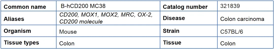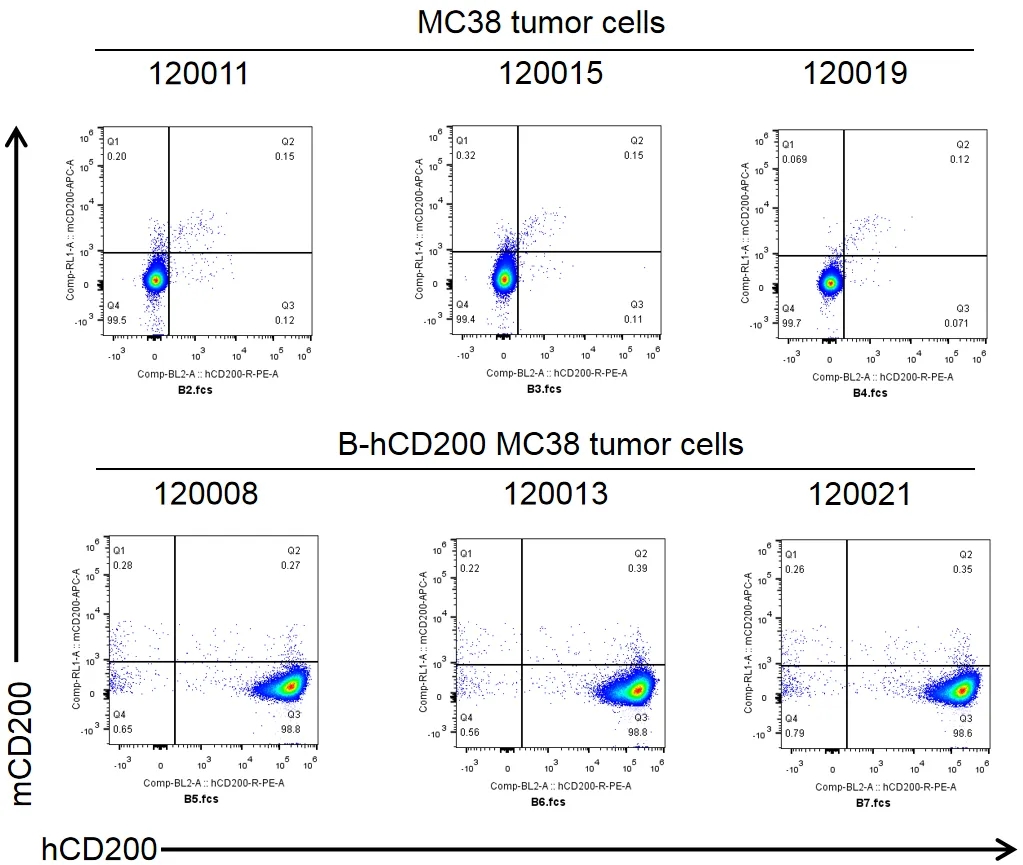 将B-hCD200 MC38细胞皮下移植到B-hCD200/hCD200R小鼠体内(n=6)。实验结束时,收集肿瘤细胞,用流式细胞术检测人CD200的表达。如图所示,人CD200在肿瘤细胞表面高度表达。因此,B-hCD200 MC38细胞可用于体内疗效研究。