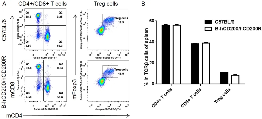 从雌性C57BL/6和纯合B-hCD200/hCD200R小鼠(n= 3,8周龄)中分离脾细胞。用流式细胞术分析脾细胞以评估T细胞亚群。纯合B-hCD200/hCD200R小鼠中CD8+ T细胞、CD4+ T细胞和Treg细胞的百分比与C57BL/6小鼠相似,这表明人源化CD200/CD200R并不会改变脾脏中这些T细胞亚群的整体发育、分化或分布。数值以平均值±SEM表示。