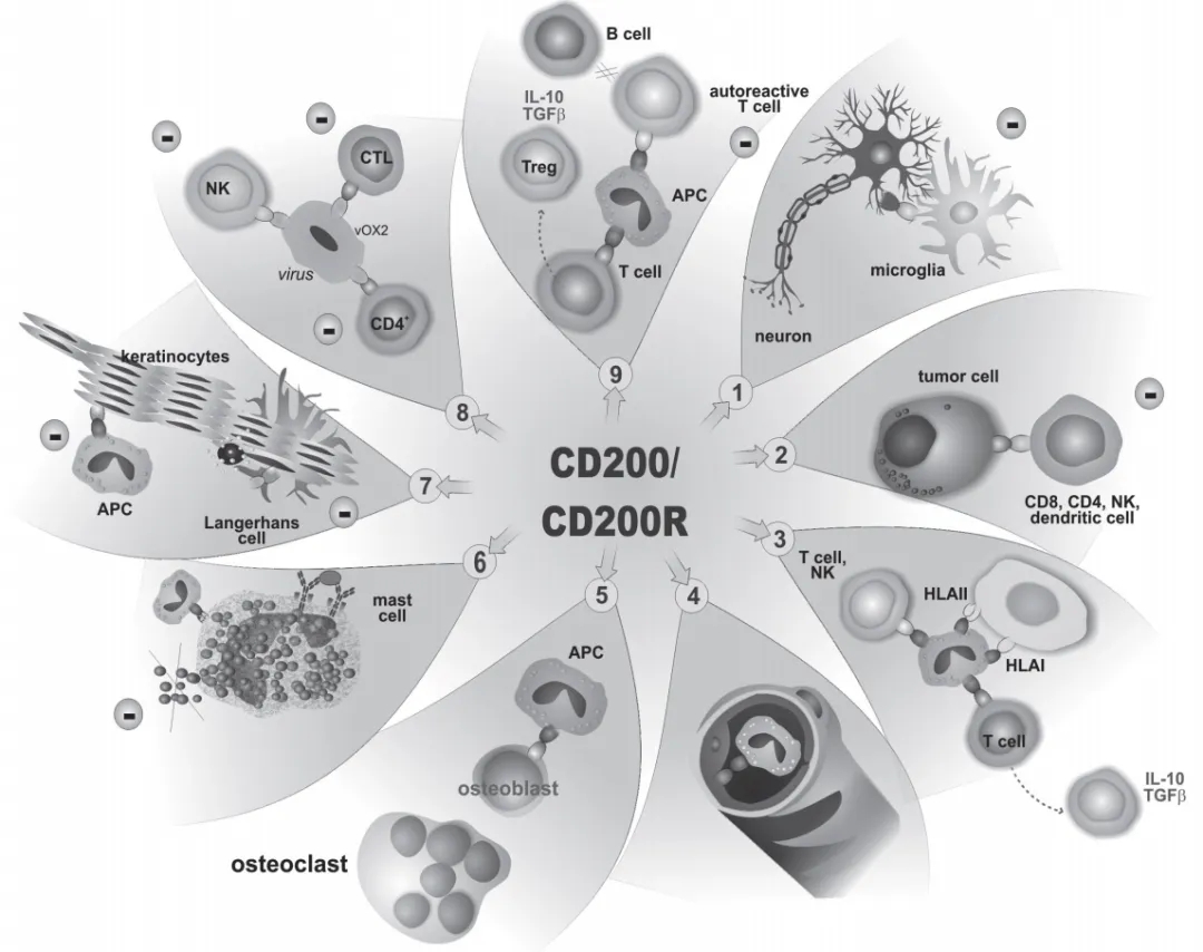 CD200/CD200R在各种人类癌细胞上对肿瘤微环境内的免疫细胞具有免疫抑制作用,创造有利于肿瘤发育、生长和扩散的条件[2]