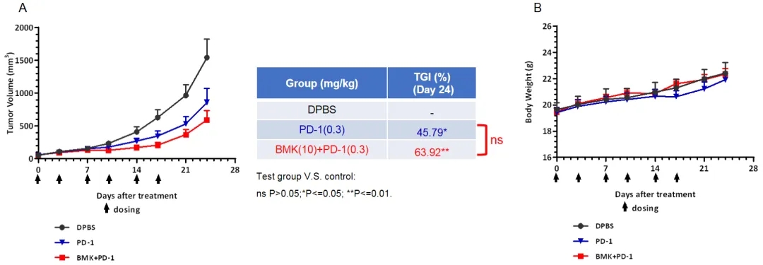 将B-hCD200 MC38细胞(5x105)皮下植入纯合B-hCD200/hCD200R小鼠(雌性,6-8周龄,n=6)体内。当肿瘤体积达到约100 mm3时,将小鼠分组进行治疗。结果显示,抗hCD200抗体联合抗mPD-1抗体可有效控制B-hCD200/hCD200R小鼠的肿瘤生长,说明B-hCD200/hCD200R小鼠为体内评价抗人CD200抗体提供了强有力的临床前模型。数值以平均值±SEM表示。采用双因素方差分析(ANOVA)检验。ns P>0.05;*P<=0.05; **P<=0.01。