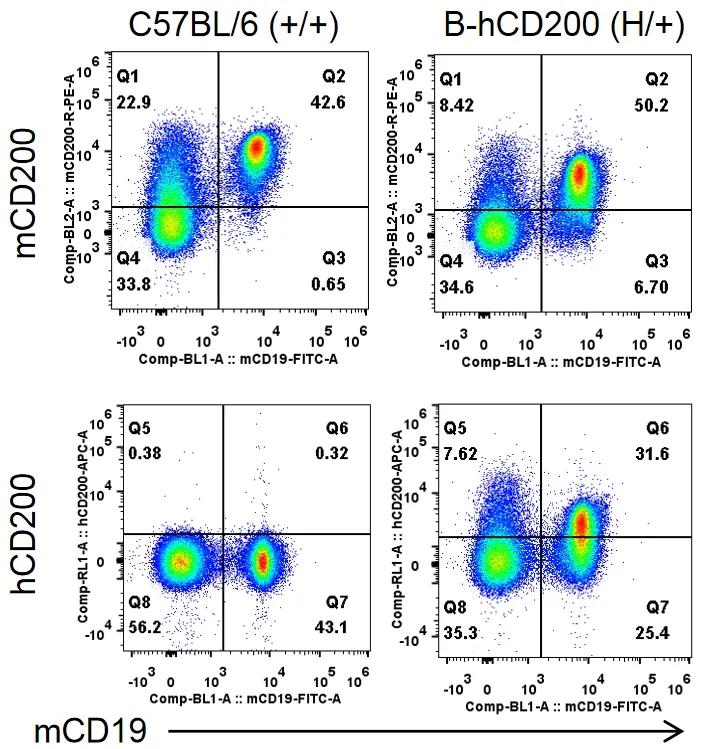 收集野生型C57BL/6小鼠(+/+)和杂合B-hCD200小鼠(H/+)的脾细胞,用抗CD200抗体流式细胞术进行分析。小鼠CD200在C57BL/6小鼠和杂合B-hCD200小鼠中均可检测到。人CD200仅在杂合B-hCD200小鼠中检测到,而在C57BL/6小鼠中检测不到。