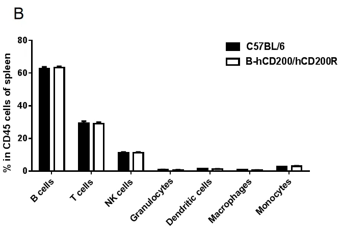 从雌性C57BL/6和纯合B-hCD200/hCD200R小鼠(n= 3,8周龄)中分离脾细胞。用流式细胞术分析脾细胞以评估白细胞亚群。纯合B-hCD200/hCD200R小鼠的T细胞、B细胞、NK细胞、树突状细胞、粒细胞、单核细胞和巨噬细胞的百分比与C57BL/6小鼠相似,表明人源化CD200/CD200R并不会改变脾脏中这些白细胞亚群的整体发育、分化或分布。数值以平均值±SEM表示。