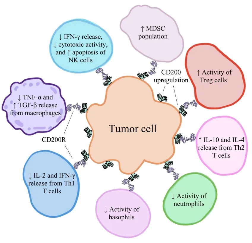 CD200在实体肿瘤中广泛表达,如胰腺导管腺癌、肺癌、卵巢癌、肾细胞癌、中枢神经系统恶性肿瘤和头颈部鳞状癌(HNSCC),其与CD200R的相互作用促进肿瘤微环境中的免疫抑制。MDSC是未成熟的髓系细胞,在肿瘤细胞中高表达,抑制抗肿瘤免疫反应[8]。CD200/CD200R相互作用通过抑制巨噬细胞、诱导调节性T细胞、将细胞因子谱从Th1切换到Th2、抑制肿瘤特异性T细胞免疫和诱导MDSC(髓源性抑制细胞)扩增,从而促进免疫抑制[9]。