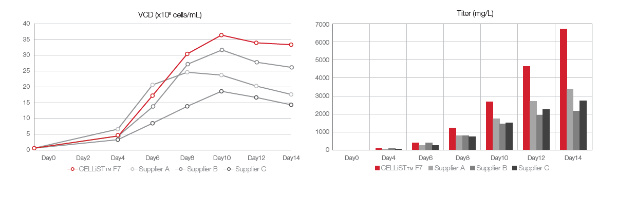 CELLiST BASAL3培养基与CELLiST F7补料培养基搭配使用,采用分批补料培养方式的测试结果。数据显示,相比于其他补料,CELLiST F7的活细胞密度和滴度浓度表现最佳。