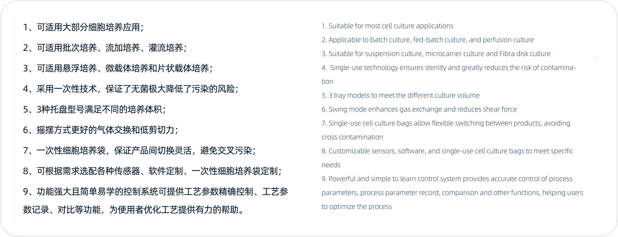 摇摆式生物反应器是专为细胞治疗、抗体药物种子扩增及疫苗生产等应用设计的一款产品,适用于各种类型的细胞培养,包括CHO、NSO、杂交瘤、HEK293、昆虫细/Baculovirus杆状病毒、腺病毒、T细胞、植物细胞和初级人类细胞株。通过控制摇摆速度、摇摆角度、气体流量、pH、DO、温度等参数,使用一次性反应袋进行细胞培养,其性能稳定,安全简便。
