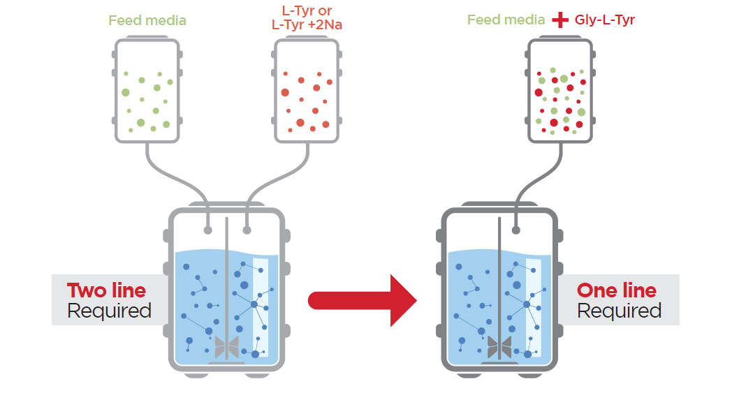 Choosing CELLiST™ Gly-L-Tyr simplifies your manufacturing process. Unlike L-Tyrosine or L-Tyr+2Na, which requires an additional, separate feed source at higher pH due to reduced solubility, Gly-L-Tyr allows for a one-line feeding process, resulting in substantial decrease in running costs. Gly-L-Tyr can be easily supplemented to the main feed, dissolved at neutral pH and provides consistent tyrosine source to your cell culture, without introducing any pH fluctuations to the culture.