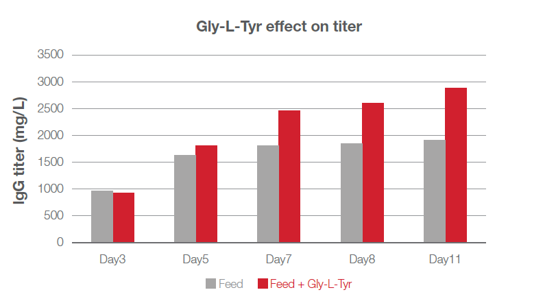 The addition of Gly-L-Tyr to the process optimizes tyrosine source supply to the cell culture and results in significant improvement to the performance and productivity of the feb-batch process. The graph below shows the increase in productivity (titer) for a fed-batch CHO cell culture.