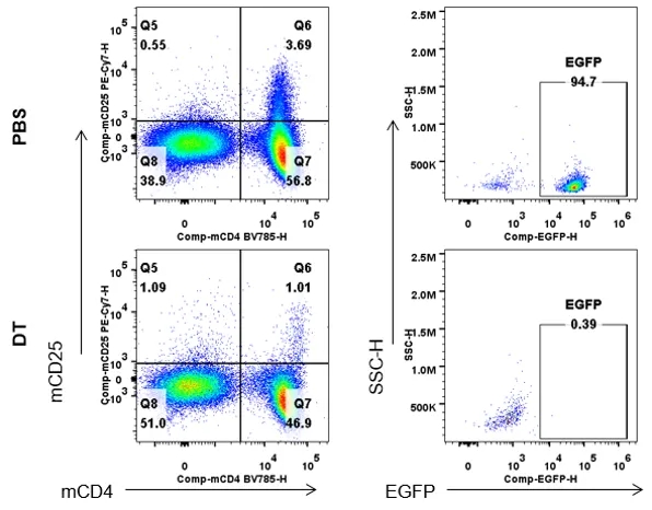 从连续两天注射PBS或DT的雄性B-Foxp3-EGFP-DTR-Luc小鼠(n=3, 7月龄)体内分离脾细胞,并通过流式细胞术对脾脏细胞进行分析,以评估EGFP表达。