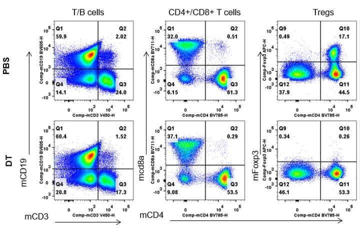 从连续两天注射PBS或DT的雄性B-Foxp3-EGFP-DTR-Luc小鼠(n=3, 7月龄)体内分离脾细胞,并通过流式细胞术对脾脏细胞进行分析,以评估白细胞亚群。