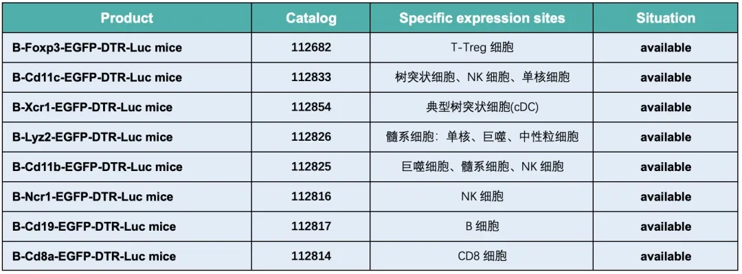 针对上述功能,百奥动物开发了一系列DTR小鼠模型,通过在不同基因插入DTR以及报告基因得到具有示踪功能的不同细胞类型的选择性清除模型。