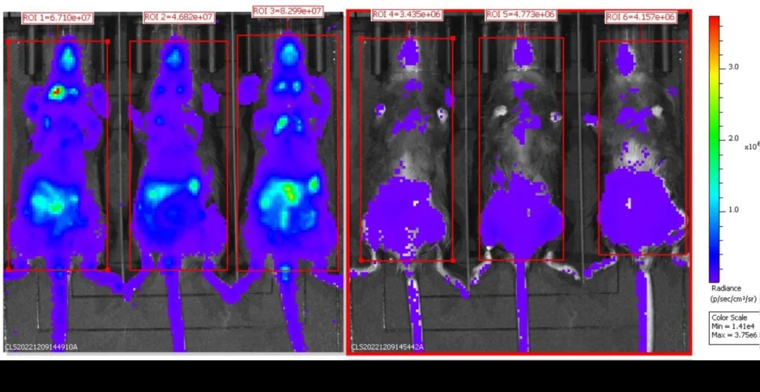 连续两天注射PBS(n=3)或DT(n=3)的B-Foxp3-EGFP-DTR-Luc小鼠被麻醉后进行生物发光成像。小鼠静脉注射 150mg/kg的D-Lucifenrin钾盐10分钟后,使用IVIS Lumina LT Inst Series III进行成像。