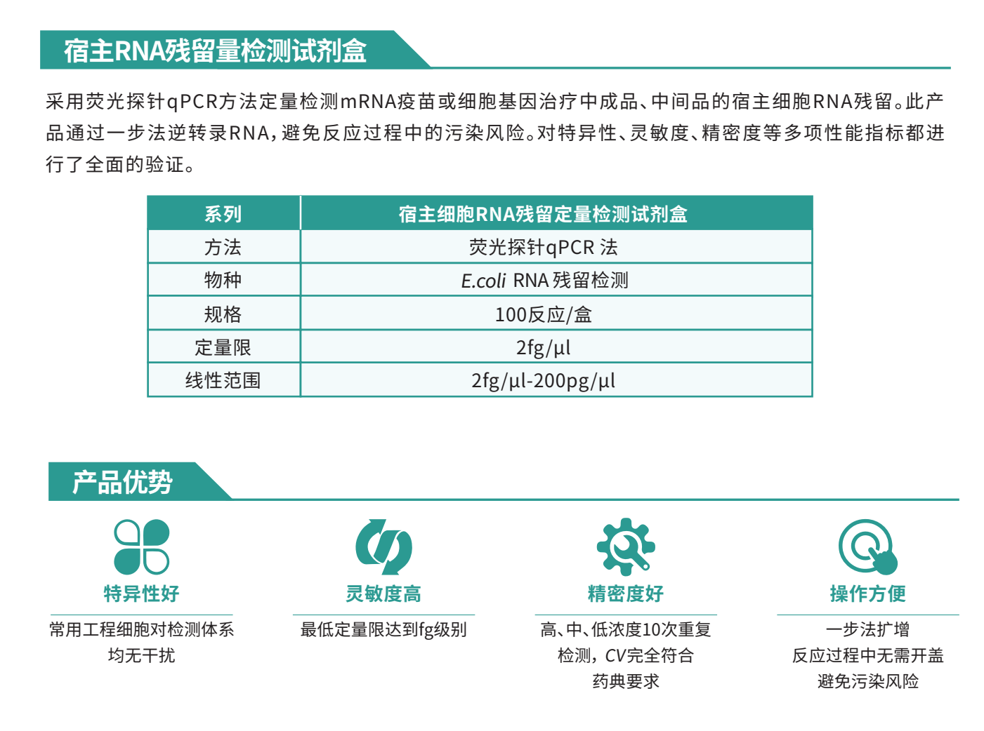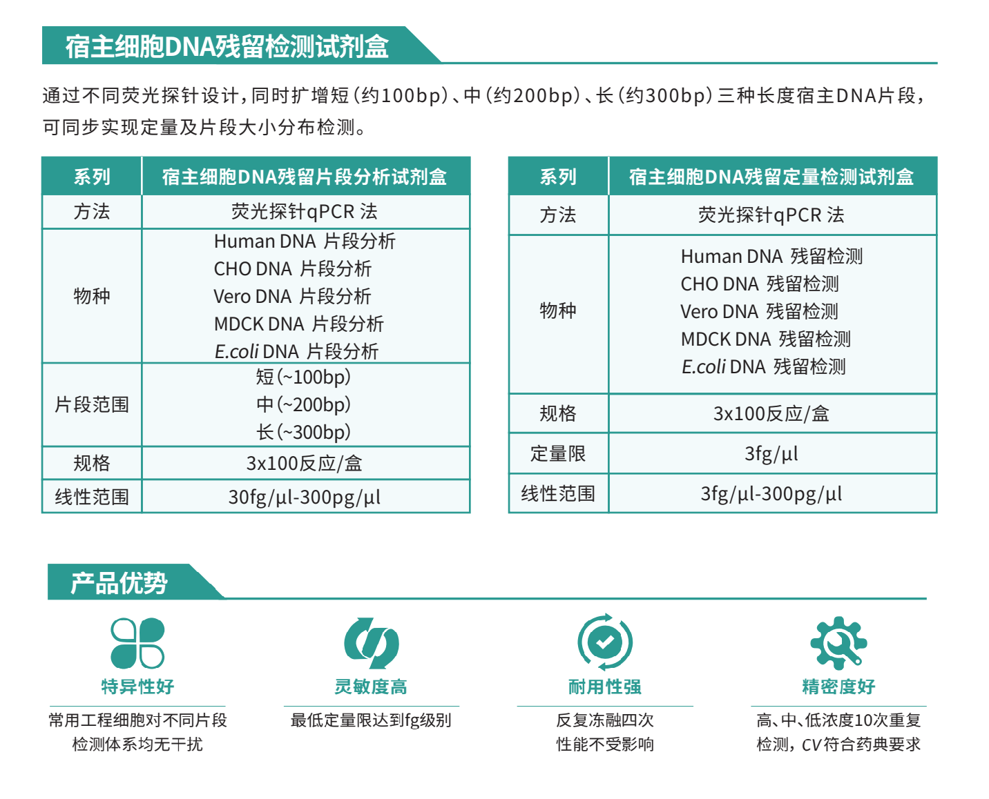 阅微基因自主研发的宿主细胞DNA/RNA残留和片段分析系列试剂盒,采用荧光探针qPCR技术,依据中国药典三部通则3407第三法定量PCR法的要求原则开发设计,按照《中国药典》和《生物制品质量控制分析方法验证技术审评一般原则》及ICH Q2(R1)《分析程序的验证》对试剂盒的特异性、定量限、线性范围、精密度等性能指标进行了全面验证,可满足不同宿主及靶标的检测需求。