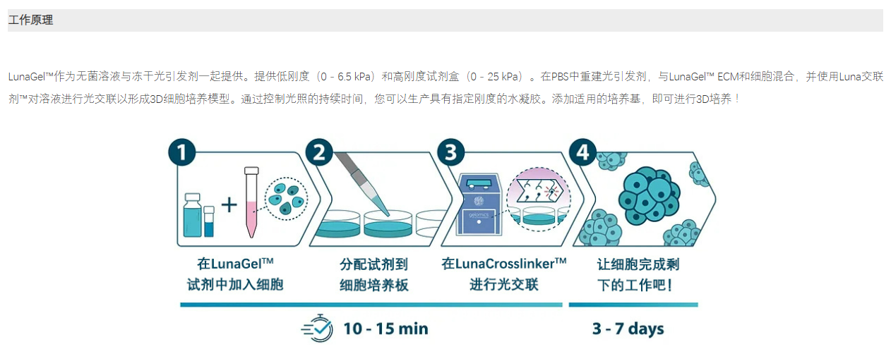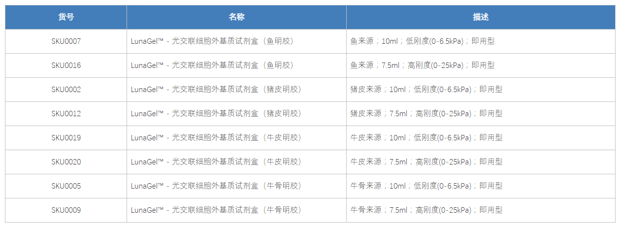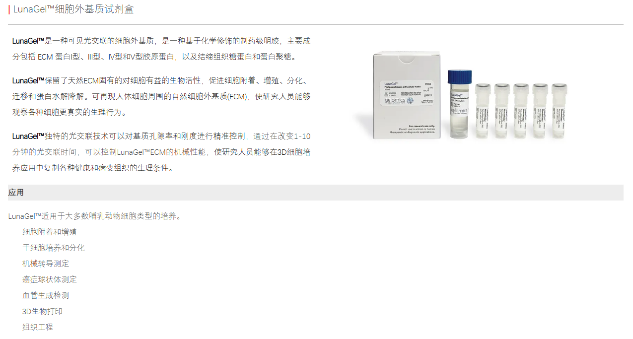 LunaGel™是一种可见光交联的细胞外基质,是一种基于化学修饰的制药级明胶,主要成分包括 ECM 蛋白I型、III型、IV型和V型胶原蛋白,以及结缔组织糖蛋白和蛋白聚糖。