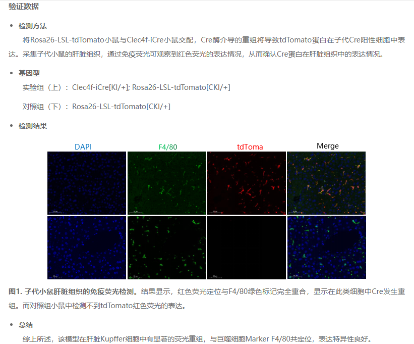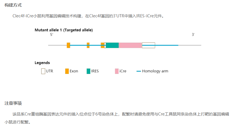 Clec4f-iCre小鼠利用基因编辑技术构建,在Clec4f基因的3’UTR中插入IRES-iCre元件。当与含有loxP位点的小鼠杂交时,子代可在KC细胞中产生由Cre重组酶介导的loxP位点间的序列重组。该品系纯合小鼠发育正常,可育。