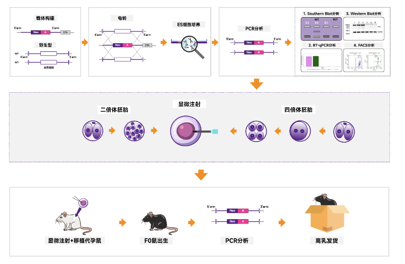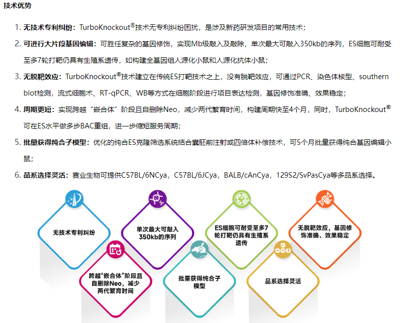 基于ES打靶技术的TurboKnockout®技术采用了独特的建系和基因改造技术,建立了具有高效遗传优势的TurboKnockout®ES细胞系,通过特定胚胎发育阶段的显微注射,使TurboKnockout®ES细胞100%代替内源ES细胞,从而实现跨越“嵌合体”阶段,把ES打靶构建周期缩短至快至4个月。且TurboKnockout®采用独特的Self-deleting Neo Cassette,所获得的TurboKnockout®小鼠与任何品系小鼠交配,都可以100%自删除Neo。即TurboKnockout®不仅实现跨越“嵌合体”阶段,还能真正自删除Neo,从而快速获得去除Neo的杂合子小鼠。