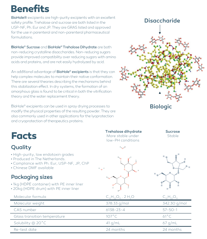 收藏BioHale® 海藻糖二水合物适用于注射或眼用制剂。特别是被广泛用于治疗性蛋白质(尤其是肠外制剂)的冻干保护。其他应用包括在脂质体冻融和冻干期间、血细胞以及单克隆抗体的稳定剂。