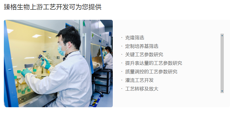依托国际先进的细胞培养技术研究实验室,以专业的技术服务团队为基础,臻格生物构建了卓越的上游工艺开发平台,该平台专注于开发稳定、高产、易于放大的优质产品和可扩展工艺,是臻格生物的核心技术之一。