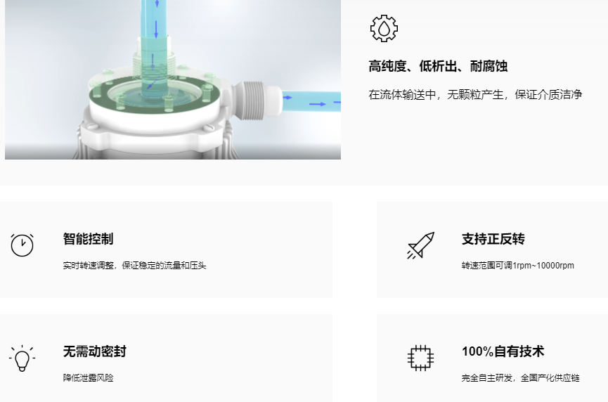 Supermag®自主研发的磁悬浮泵,可用于高纯溶液,特殊介质的输送。转子悬浮在液体中工作,无机械摩擦、不产生颗粒、低剪切、低析出。流量压头范围宽、脉动小、控制智能、体积紧凑,是半导体高端制程工艺升级过程中不可或缺的核心装备。
