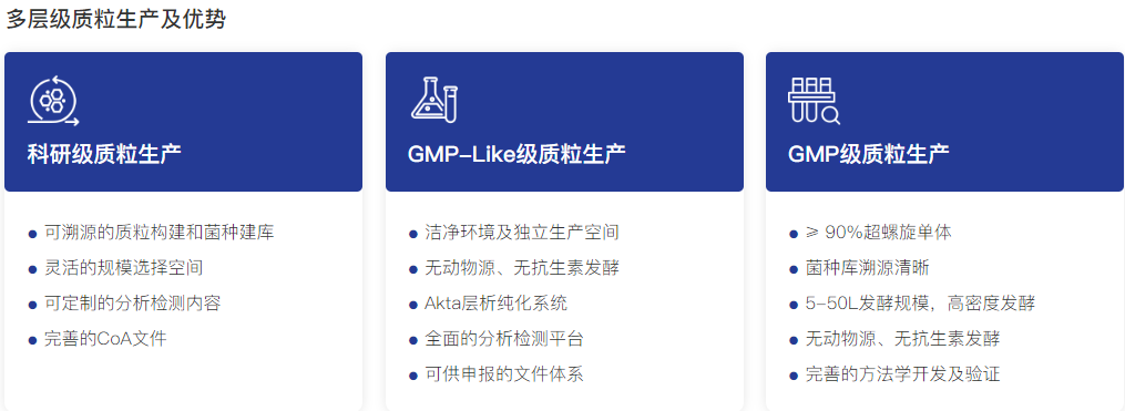 左旋星生物的质粒生产平台致力于提供多层级的定制化质粒生产服务,旨在有效地促进客户项目的快速进展。本平台涵盖从质粒菌种的构建、克隆筛选、菌种建库、到工艺开发等初步阶段的服务,并扩展到非临床研究级别及临床用GMP级别的质粒生产。我们提供的不仅是全面的服务范围,还包括一体化的管理和执行,确保从初步研究到临床应用的每一环节均达到最高的质量与安全标准。