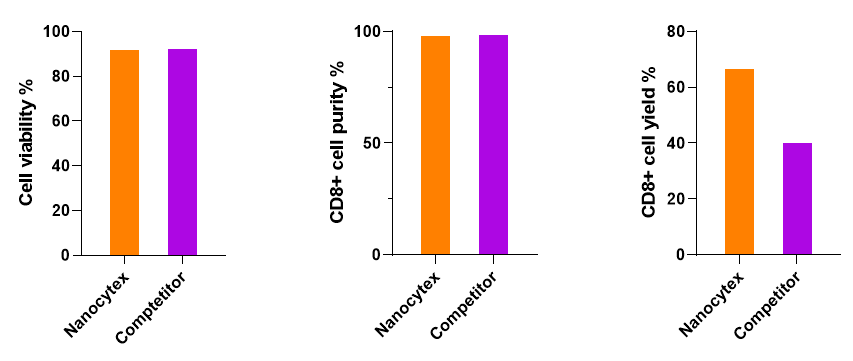 使用 Rebeads® NanoCytex CD8磁珠与竞品磁珠对人PBMC样本中的T细胞进行富集,通过流式检测分选得到的细胞组分中CD8+T细胞活性、纯度及分选效率,结果表明人CD8纳米磁珠的分选效果与竞品相当。