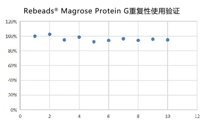 图Rebeads® Magrose Protein G重复使用次数验证(磁珠可重复使用和再生,经过10次不间断的纯化操作后,仍能保持较高的lgG结合能力)