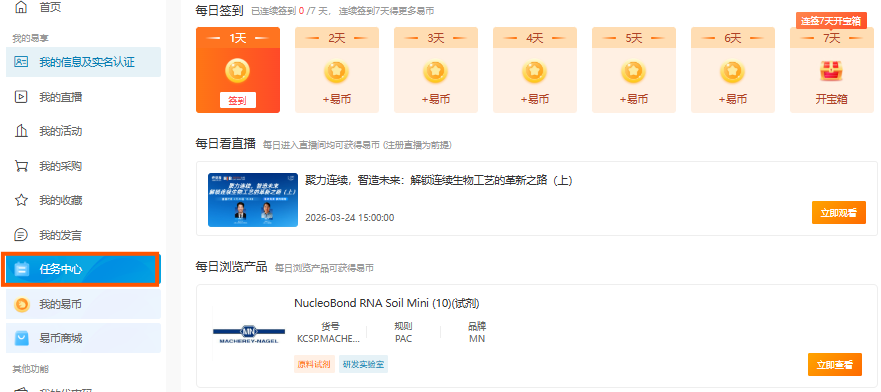 登录平台至【个人中心】-【任务中心】查看每日任务:连续签到、观看直播、浏览产品、发布需求、商家打卡等均可获得相应易币!