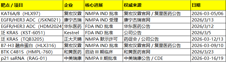 进展:NMPA 默示许可(2026-03-12),拟用于晚期恶性肿瘤。