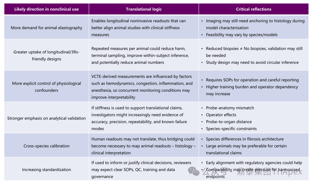 Looking forward, the role of animal elastography may evolve in response to the regulatory and translational emphasis on noninvasive biomarkers. FDA’s recent action may incentivize sponsors to pursue clearer nonclinical-to-clinical continuity. Considerations summarized below offers a preliminary synthesis of factors that may influence how animal VCTE could be applied in future nonclinical studies.