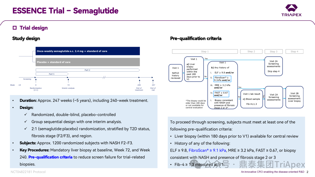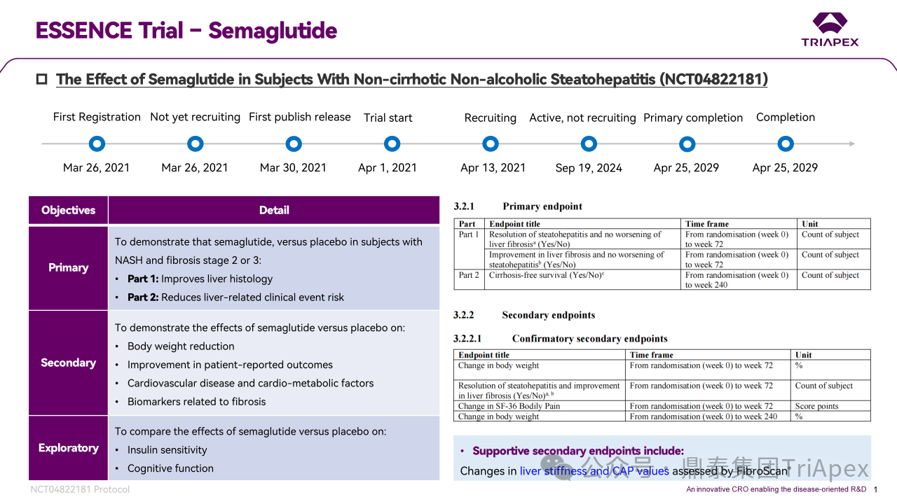 ESSENCE is a randomized, multicenter, double-blinded, parallel-group Phase 3 trial to evaluate the effect of semaglutide (subcutaneous, 2.4 mg) in MASH patients with fibrosis F2 or F3[23].