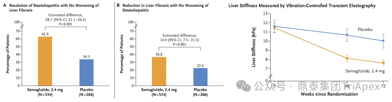 Efficacy At Week 72, semaglutide treatment was associated with greater resolution of histological disease activity and a more pronounced reduction in liver stiffness measured by VCTE (VCTE-LSM) compared to control. The VCTE confidence intervals were unadjusted for multiplicity and was interpreted descriptively[25].