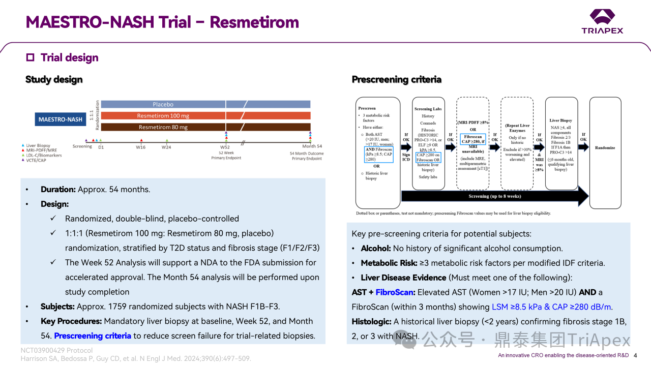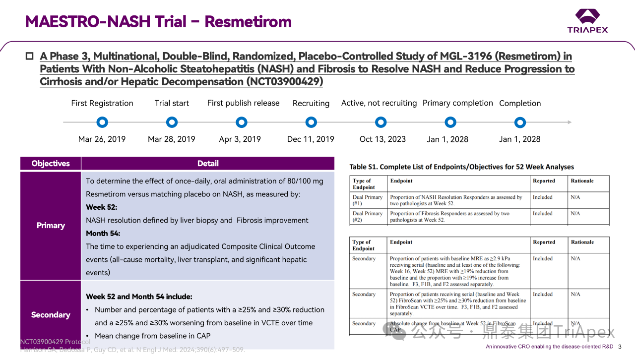 MAESTRO-NASH is multicenter, double-blind, randomized, placebo-controlled Phase 3 trial to evaluate the effect of resmetirom (oral, 80 mg, 100 mg) in MASH patients with fibrosis F1B-F3. This study was designed to support two regulatory approval milestones, accelerated approval based on Week 52 liver histology, and full approval contingent upon Month 54 clinical outcomes[26][27].