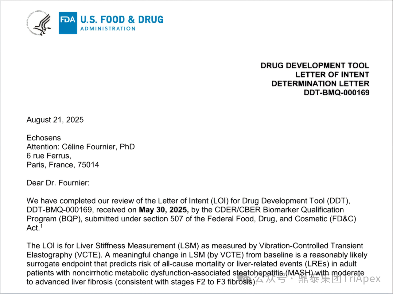 In this context, FDA CDER’s acceptance of the LOI for Drug Development Tool (DDT) under the Biomarker Qualification Program in August 2025 from Echosens marks a milestone for the field. The proposed LSM by VCTE as a “reasonably likely surrogate endpoint” for clinical trials intends to predict the risk of all-cause mortality or liver-related events in MASH adults with moderate-to-several (F2-F3) fibrosis[11]. While qualification plan (QP) and full qualification package (FQP) are still required before final determination, this signals regulatory openness and could potentially establish a pathway for NITs in MASH drug development. Figure 5 Letter of Intent from FDA[11]